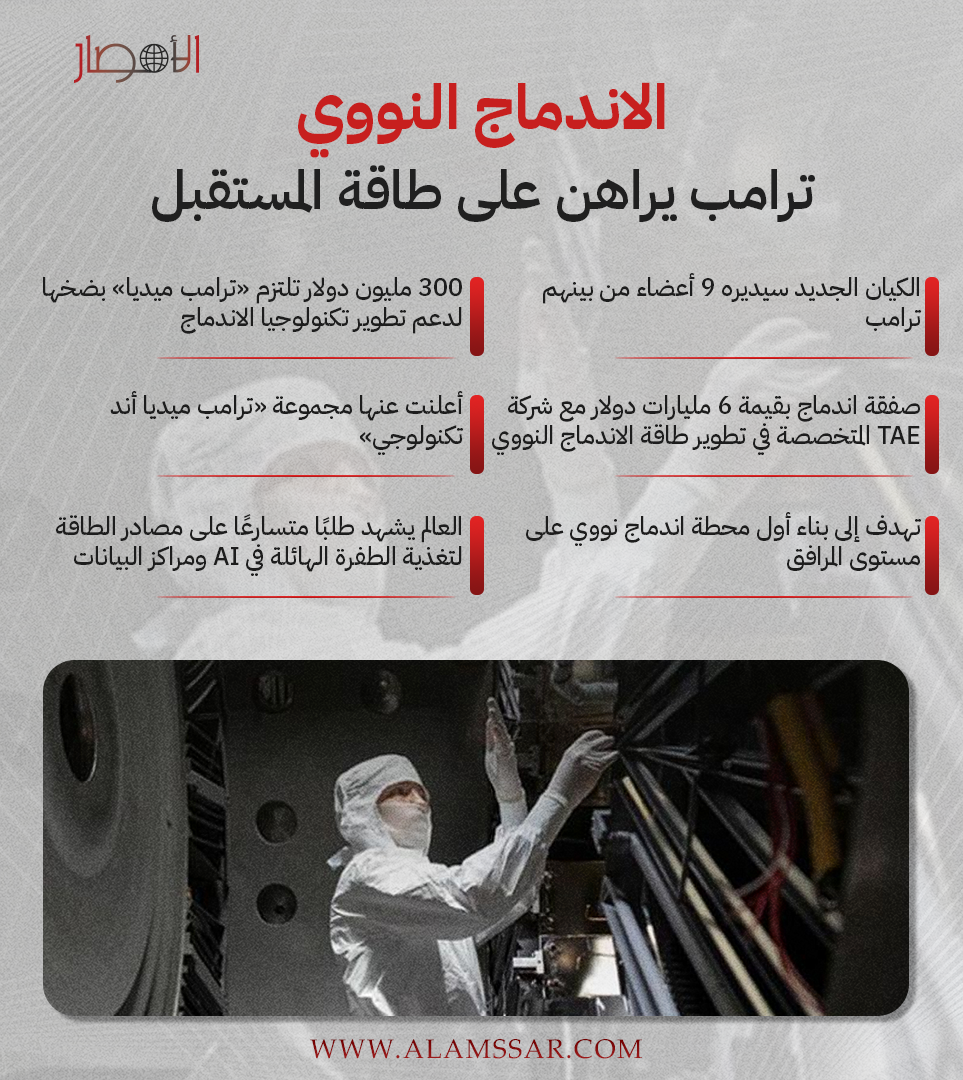 في خطوة غير متوقعة تعكس تحوّلًا لافتًا في مسار استثماراته، أعلن عن اندماج ضخم بين مجموعة «ترامب ميديا آند تكنولوجي»، المالكة لمنصة «تروث سوشيال»، وشركة TAE Technologies المتخصصة في تطوير طاقة الاندماج النووي، في صفقة قُدّرت قيمتها بنحو 6 مليارات دولار، لتفتح الباب أمام دخول ترامب رسميًا إلى أحد أكثر قطاعات الطاقة تعقيدًا وطموحًا.