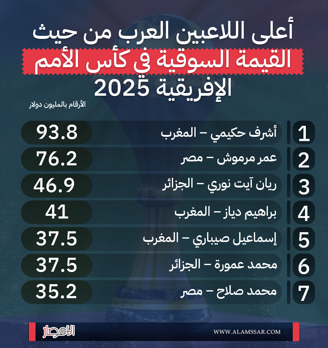 إنفوجراف| أعلى اللاعبين العرب من حيث القيمة السوقية في كأس الأمم الإفريقية 2025