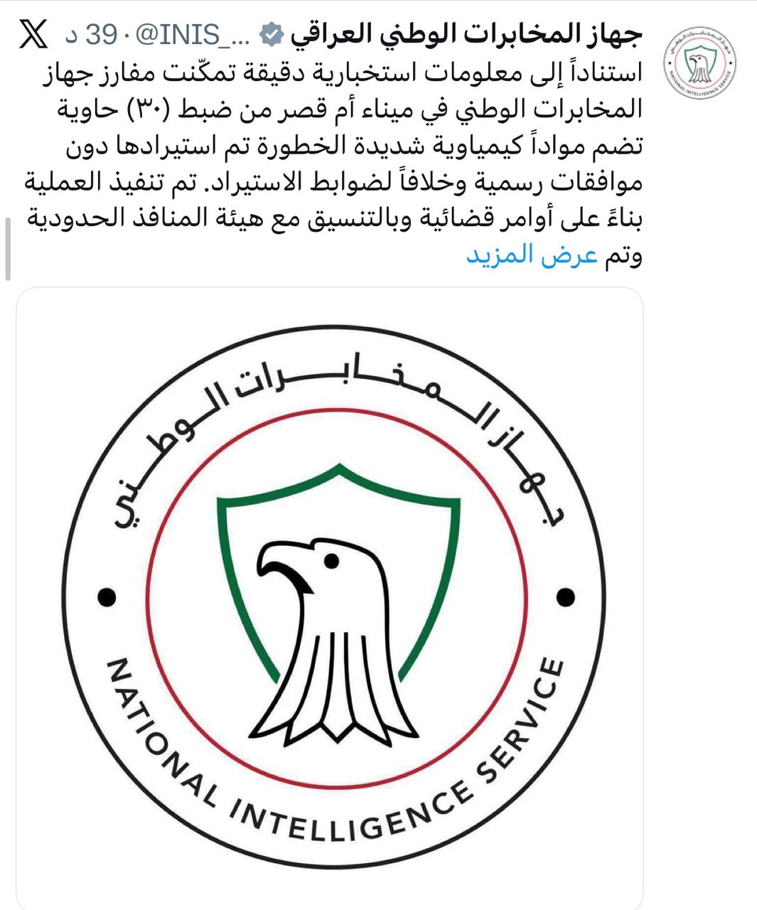 استناداً إلى معلومات استخبارية دقيقة تمكنت مفارز جهاز المخابرات الوطني في ميناء أم قصر من ضبط (30) حاوية تضم مواد كيمياوية شديدة الخطورة تم استيرادها دون موافقات رسمية وخلافاً لضوابط الاستيراد وذلك بحسب بيان جهاز المخابرات الوطني العراقي.