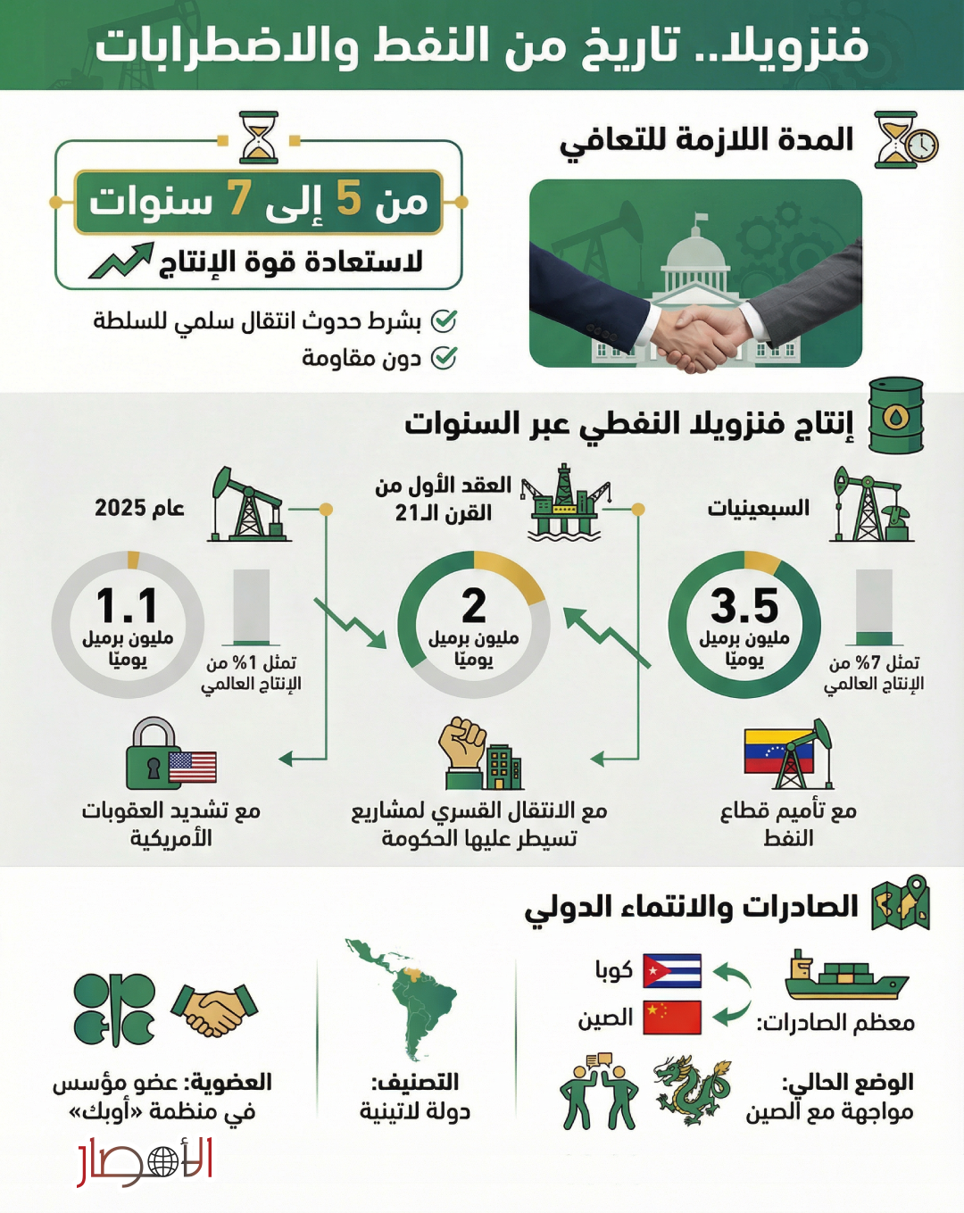 تجدر الإشارة إلى أن فنزويلا، رغم كل هذه التحديات، ما زالت تعتبر دولة رئيسية في المنطقة اللاتينية، وعضوًا مؤسسًا في منظمة «أوبك»، ما يتيح لها الاحتفاظ بنفوذ محدد في أسواق النفط العالمية، رغم انخفاض إنتاجها مقارنة بالسبعينيات.