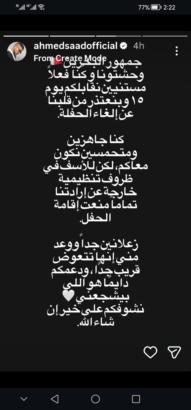 وقال أحمد سعد في منشوره: جمهور البحرين وحشتونا وكنا فعلًا مستنيين نقابلكم يوم 15، وبنعتذر من قلبنا عن إلغاء الحفلة، كنا جاهزين ومتحمسين نكون معاكم، لكن للأسف في ظروف تنظيمية خارجة عن إرادتنا تمامًا منعت إقامة الحفل، زعلانين جدًا ووعد مني إنها تتعوض قريب جدًا".