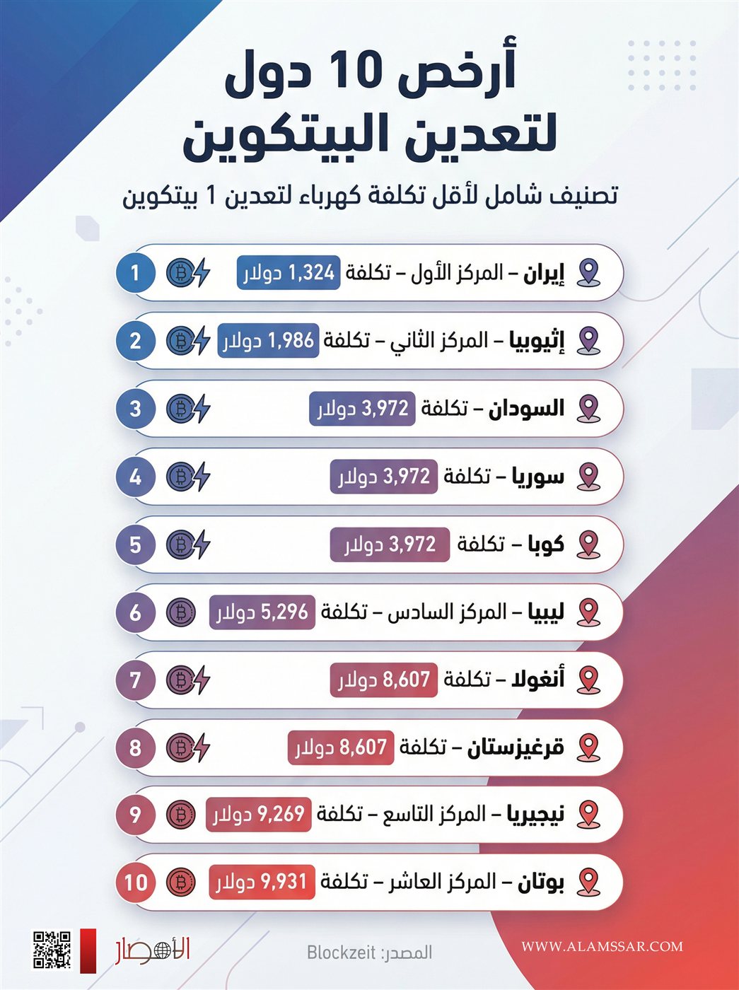 نشرت منصة Blockzeit مؤخرًا تقريرًا رقميًا وفيديوجراف يوضح أرخص 10 دول لتعدين البيتكوين في العالم، استنادًا إلى تكلفة توليد الكهرباء المطلوبة لتشغيل أجهزة التعدين. ويعكس هذا التصنيف الفروقات الكبيرة بين الدول في تكاليف الطاقة، وهو عامل أساسي يؤثر على جدوى الاستثمار في العملات الرقمية ونجاح مشروعات التعدين.