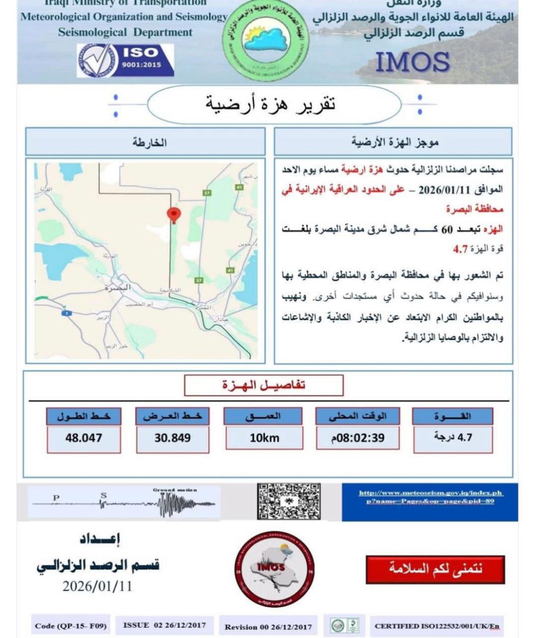العراق.. زلزال يضرب شمال شرق البصرة ويصل إلى 4.7 درجات