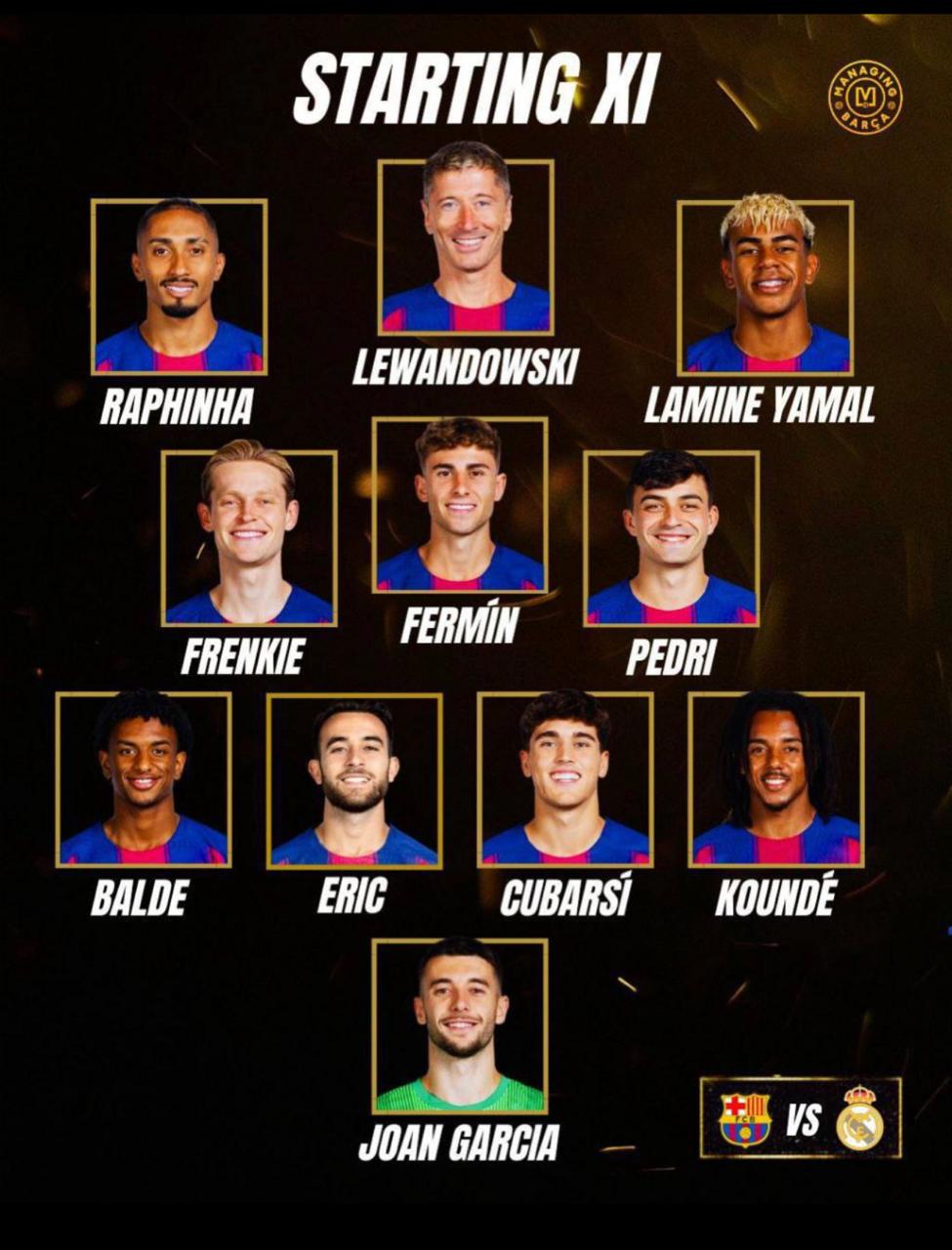 ويشهد تشكيل برشلونة عودة لامين يامال وروبرت ليفاندوفسكي إلى التشكيلة الأساسية، بعدما شارك يامال بديلاً في نصف النهائي أمام أتلتيك بلباو بسبب وعكة صحية، ليقود الهجوم الكتالوني إلى جانب رافينيا في مواجهة الغريم التقليدي.