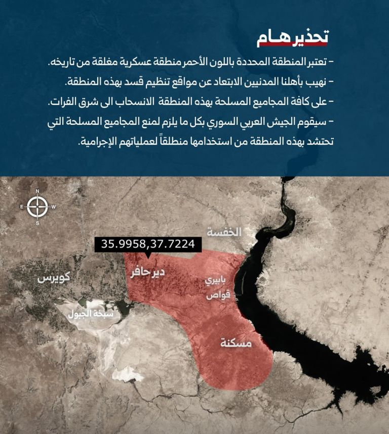 وقال بيان صادر عن هيئة العمليات في الجيش السوري، إن المنطقة المحددة باللون الأحمر على الخرائط العسكرية باتت منطقة عسكرية مغلقة اعتباراً من تاريخه.