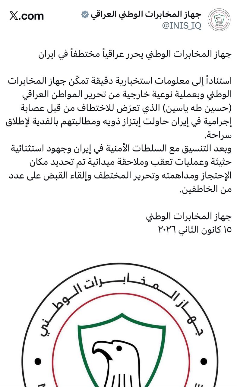 وذكر الجهاز في بيان، تلقته وكالة الأنباء العراقية (واع)، أنه "استناداً إلى معلومات استخبارية دقيقة، تمكّن جهاز المخابرات الوطني وبعملية نوعية خارجية من تحرير المواطن العراقي (حسين طه ياسين) الذي تعرّض للاختطاف من قبل عصابة إجرامية في إيران حاولت ابتزاز ذويه ومطالبتهم بفدية لإطلاق سراحه".