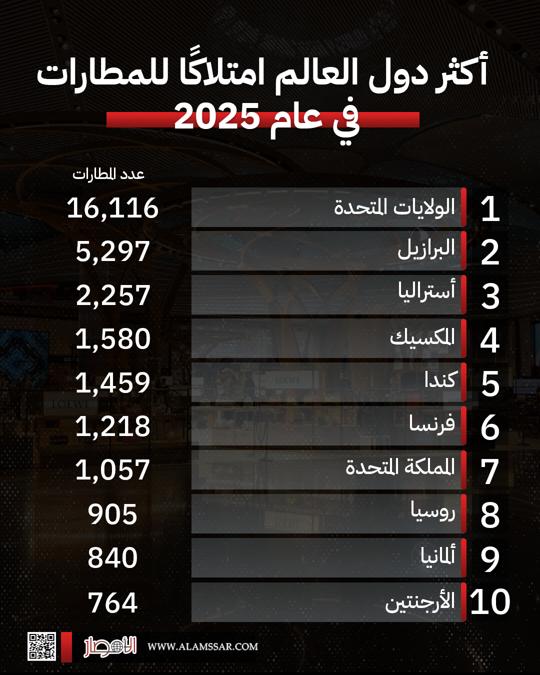 انفوجراف.. أكثر دول العالم امتلاكًا للمطارات في عام 2025