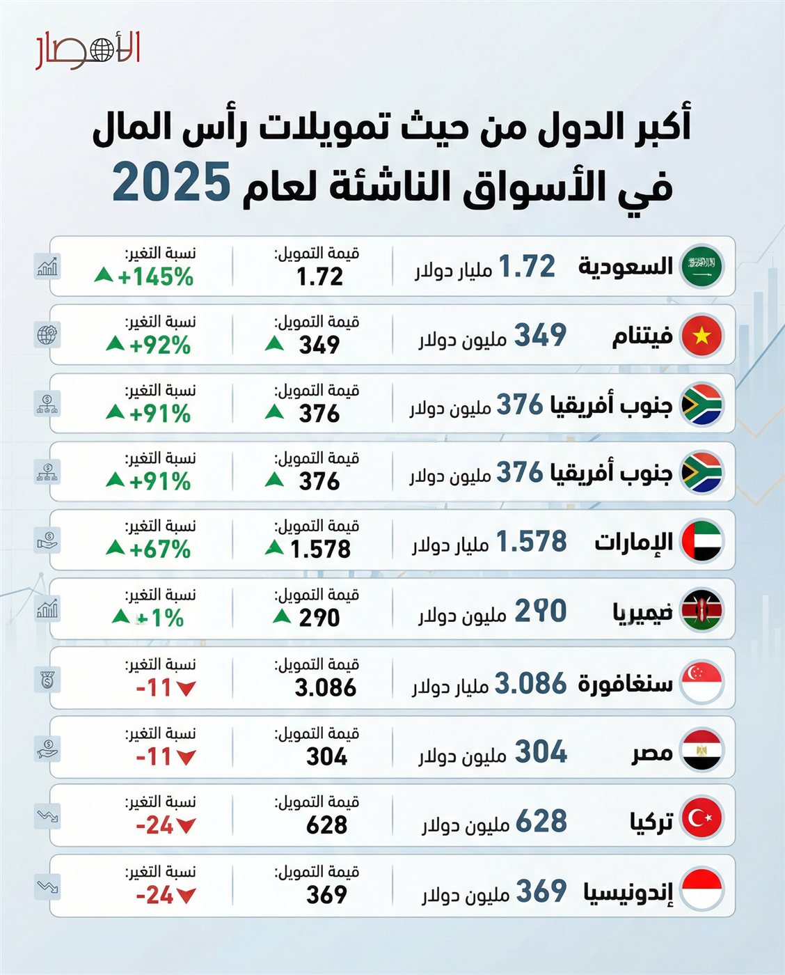 انفوجراف.. أكبر الدول من حيث تمويلات رأس المال في الأسواق الناشئة 2025