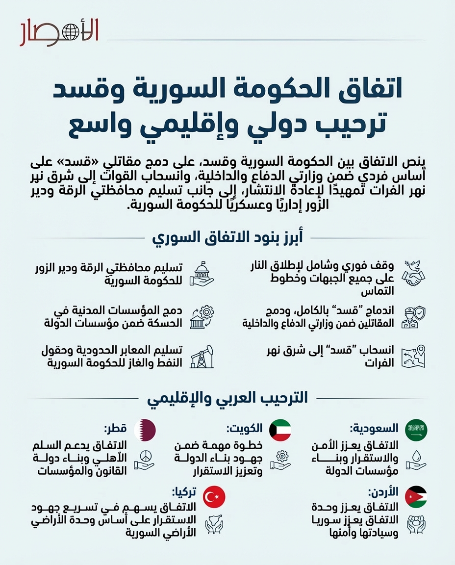 إنفوجراف| اتفاق الحكومة السورية وقسد.. ترحيب دولي وإقليمي واسع