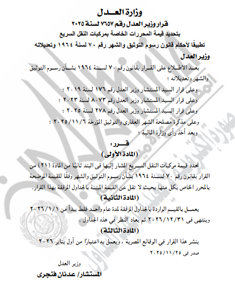 نشرت الجريدة الرسمية اليوم نص قرار المستشار عدنان فنجرى وزير العدل بتحديد قيمة رسوم التوثيق والشهر بالمحررات الخاصة بمركبات النقل السريع، تطبيقًا لأحكام قانون رسوم التوثيق والشهر رقم 70 لسنة 1964 وتعديلاته.