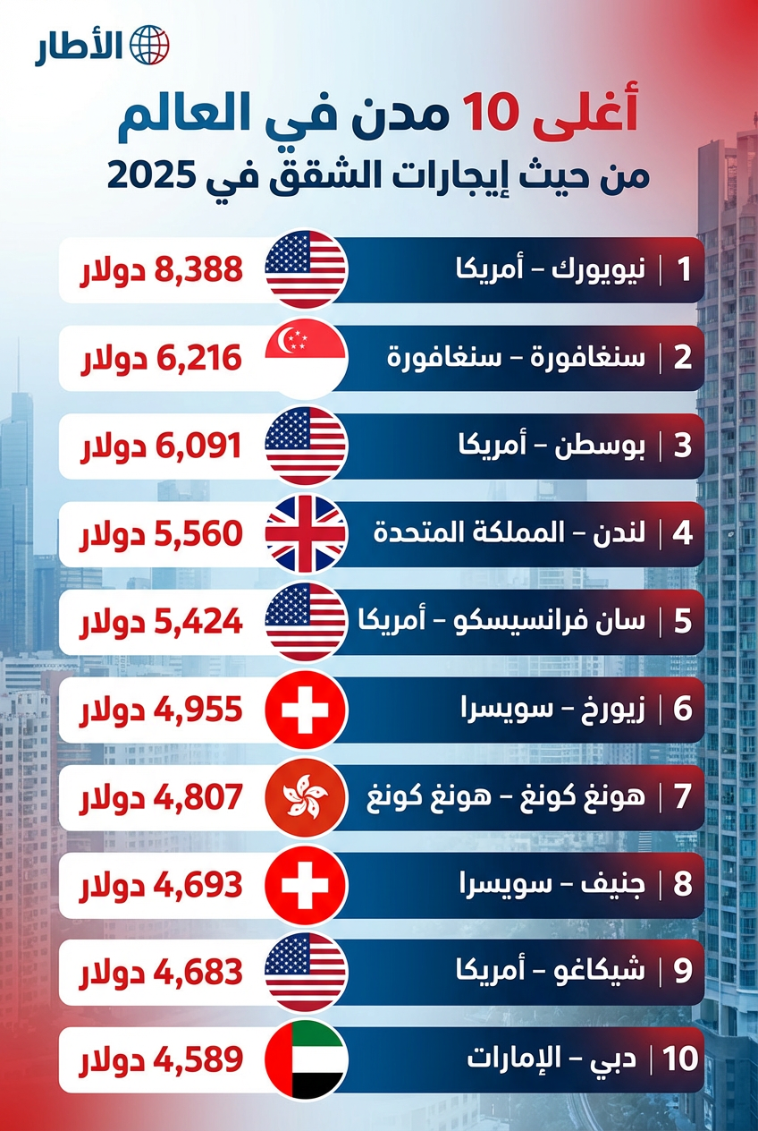 انفوجراف.. أغلى 10 مدن في العالم من حيث إيجارات الشقق في 2025