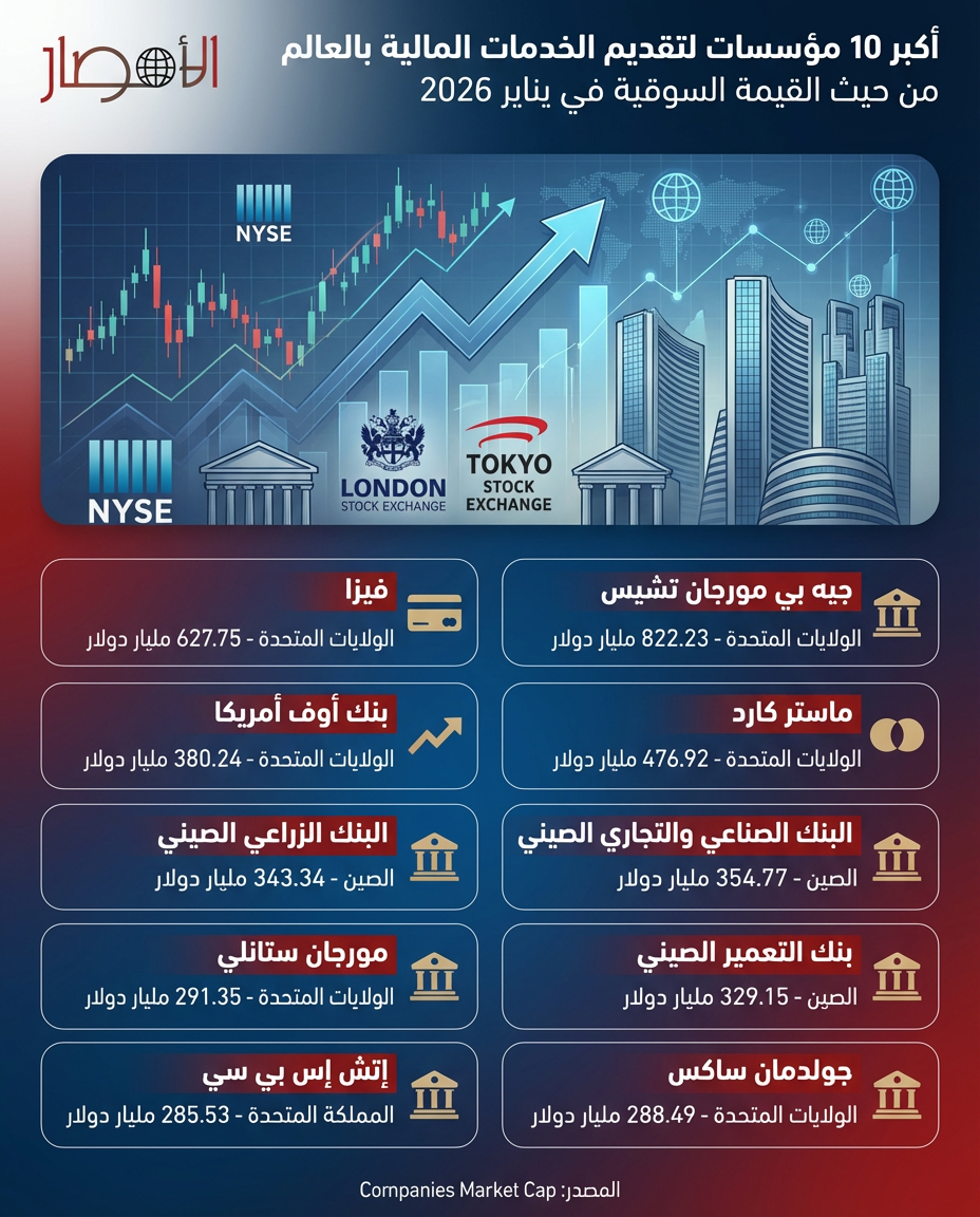 انفوجراف.. أكبر 10 مؤسسات لتقديم الخدمات المالية بالعالم من حيث القيمة السوقية في يناير 2026