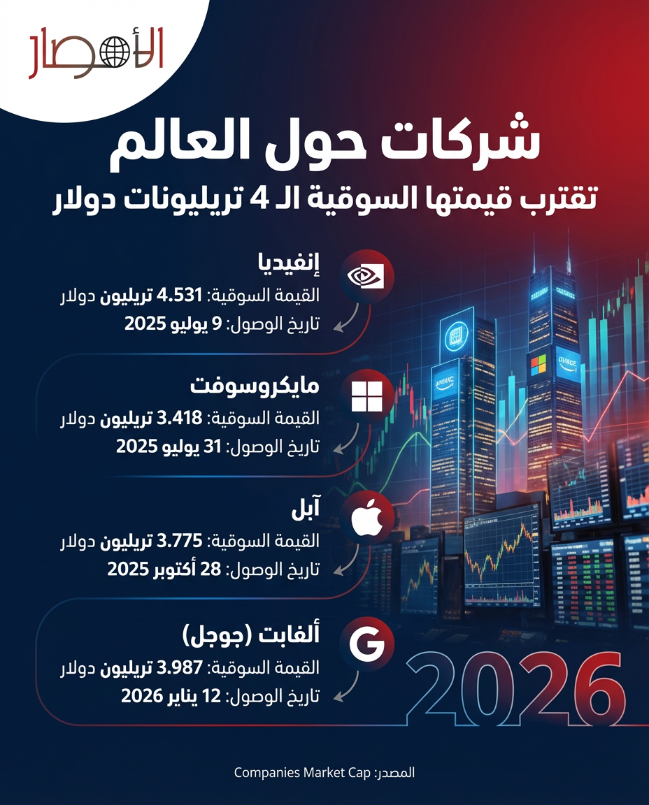 إنفوجراف| شركات حول العالم تقترب قيمتها السوقية من 4 تريليونات دولار