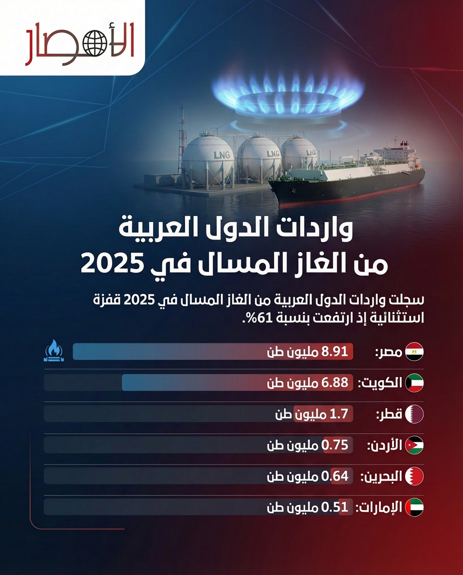 سجلت واردات الدول العربية من الغاز المسال في 2025 قفزة استثنائية إذ ارتفعت بنسبة 61%.