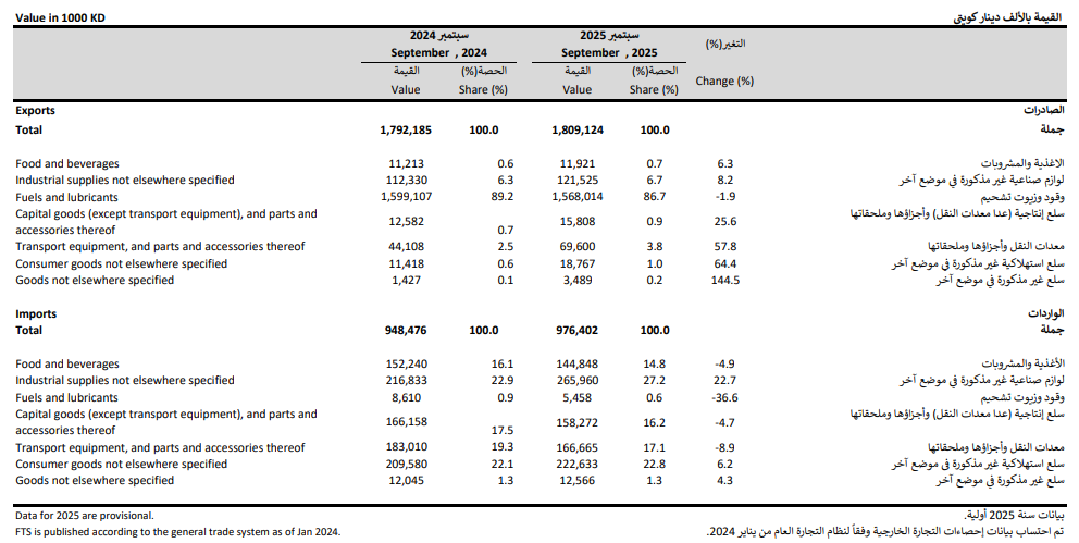 ولفت التقرير إلى أن حجم التبادل التجاري للكويت وصل في سبتمبر/أيلول 2025 إلى 2.79 مليار دينار، مقابل 2.74 مليار دينار في الشهر المماثل من العام السابق له.
