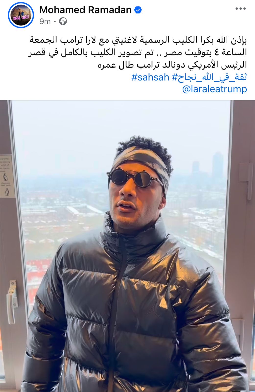 وكتب محمد رمضان عبر حسابه على موقع التواصل الاجتماعي فيسبوك: “الأغنية اللي عاملة قلق من قبل نزولها لارا ترامب ومحمد رمضان دلوقتي على جميع المنصات السمعية، Sah Sah.. Out Now، ثقة في الله نجاح”