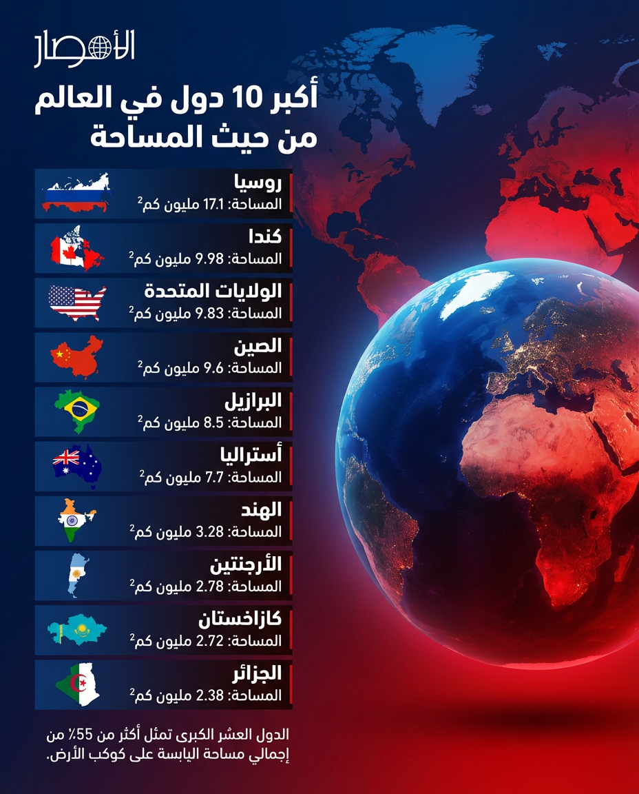 الدول العشر الكبرى تمثل أكثر من 55٪ من إجمالي مساحة اليابسة على كوكب الأرض.