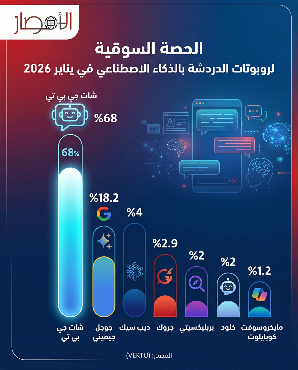 بالإنفوجراف| الحصة السوقية لروبوتات الدردشة بالذكاء الاصطناعي في يناير 2026