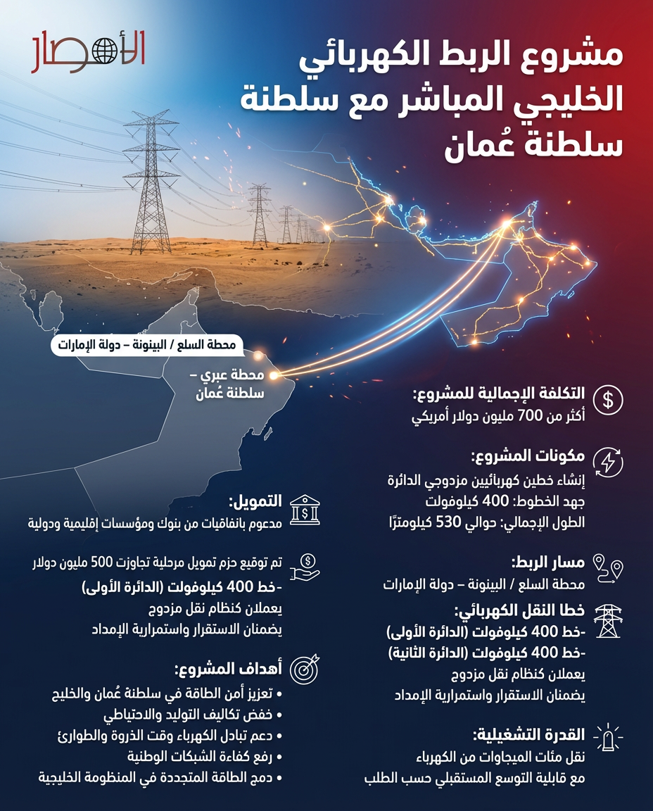 بالإنفوجراف.. مشروع الربط الكهربائي الخليجي المباشر مع سلطنة عُمان