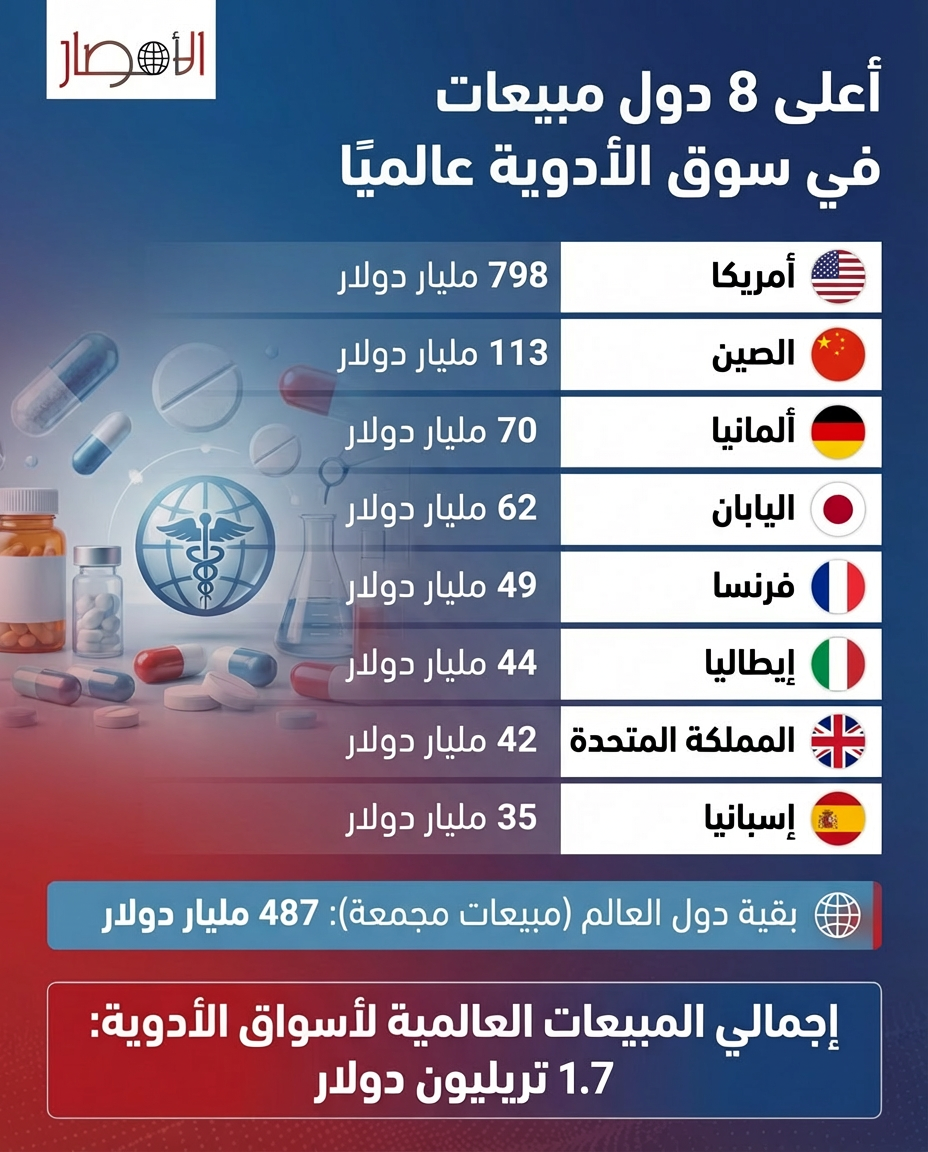 كشف أحدث تقرير عالمي عن حجم مبيعات سوق الأدوية حول العالم، أن الولايات المتحدة الأمريكية تظل المتصدرة بلا منازع، مسجلة مبيعات تصل إلى 798 مليار دولار، وهو رقم يعكس القوة الاقتصادية والتجارية للقطاع الصحي الأمريكي وقدرته على الابتكار في الأدوية والمستلزمات الطبية.