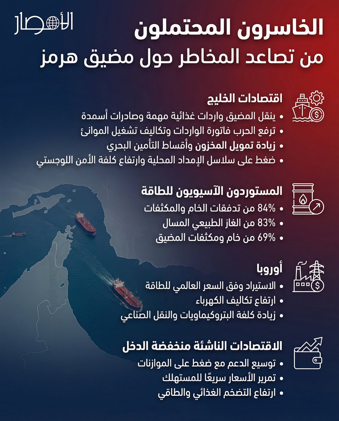 بالإنفوجراف.. الخاسرون المحتملون من تصاعد المخاطر حول مضيق هرمز