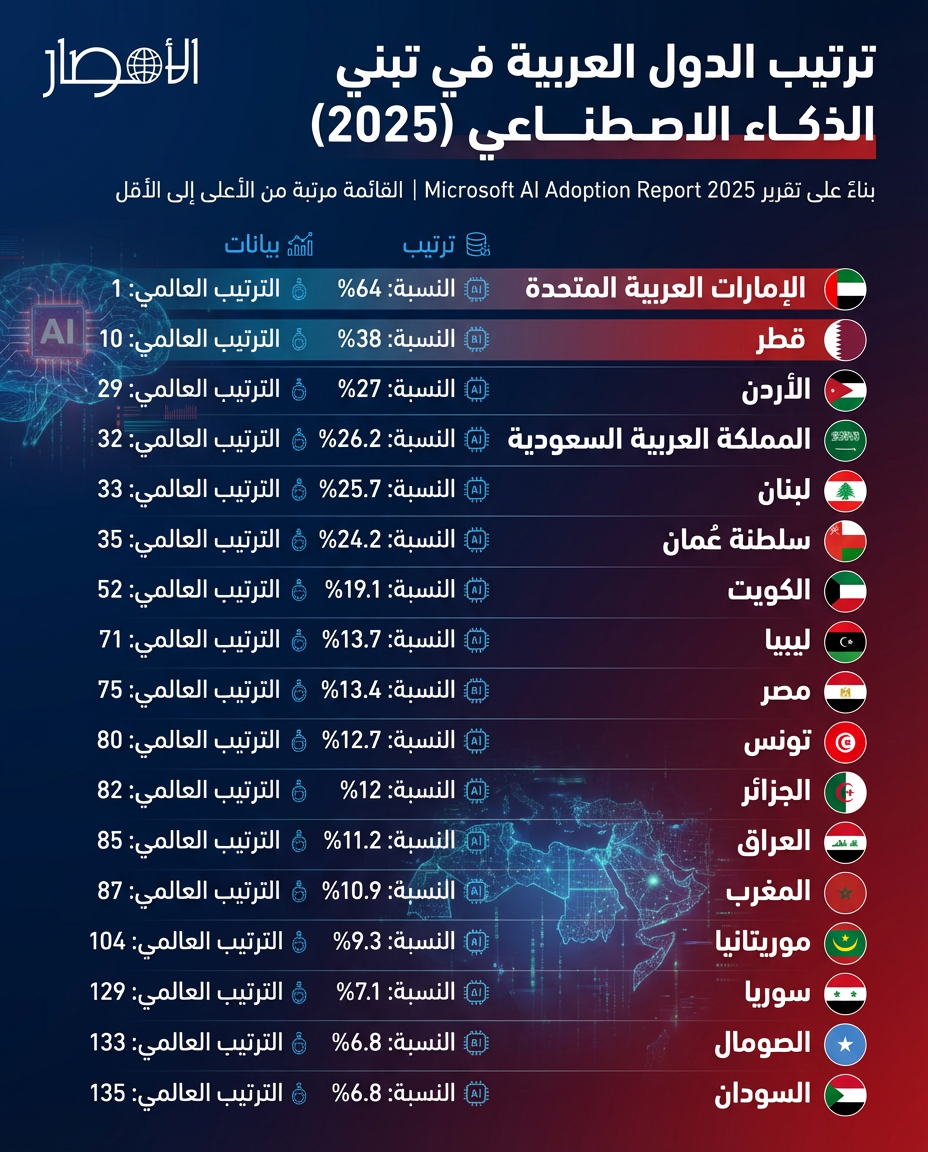 بالإنفوجراف| ترتيب الدول العربية في تبني الذكاء الاصطناعي (2025)