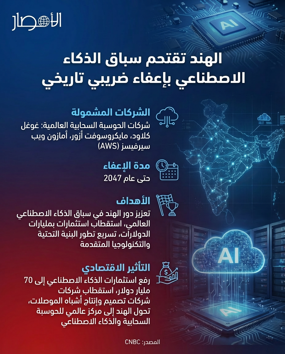 أعلنت الحكومة الهندية عن تطبيق إعفاء ضريبي استثنائي لمدة تصل إلى 20 عامًا للشركات العاملة في مجال الحوسبة السحابية، في خطوة تهدف إلى تحويل البلاد إلى مركز عالمي للذكاء الاصطناعي والخدمات الرقمية.