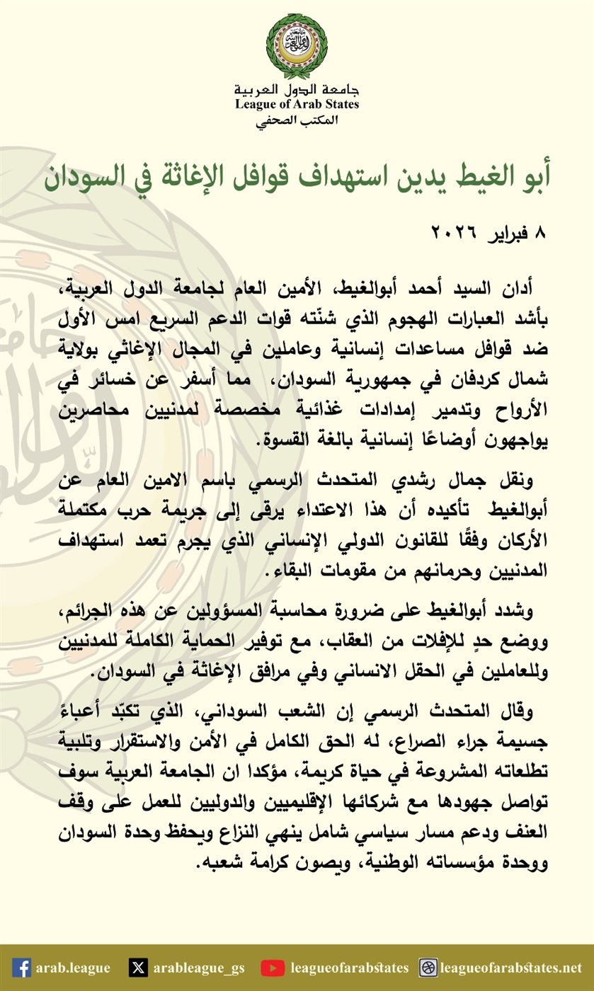 أعلن أحمد أبو الغيط، الأمين العام لجامعة الدول العربية، إدانته بأشد العبارات الهجوم الذي شنته قوات الدعم السريع أمس الأول ضد قوافل مساعدات إنسانية وعاملين في المجال الإغاثي بولاية شمال كردفان في جمهورية السودان، مما أسفر عن خسائر في الأرواح وتدمير إمدادات غذائية مخصصة لمدنيين محاصرين يواجهون أوضاعاً إنسانية بالغة القسوة.