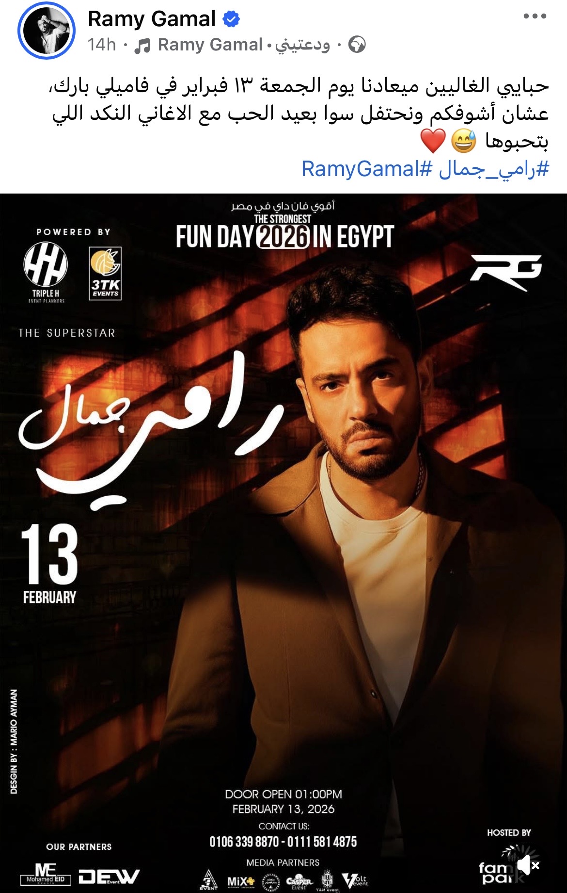 وكتب رامي جمال عبر فيسبوك: “حبايبى الغاليين ميعادنا يوم الجمعة ١٣ فبراير فى فاميلى بارك، عشان أشوفكم ونحتفل سوا بعيد الحب مع الاغانى النكد اللى بتحبوها”.