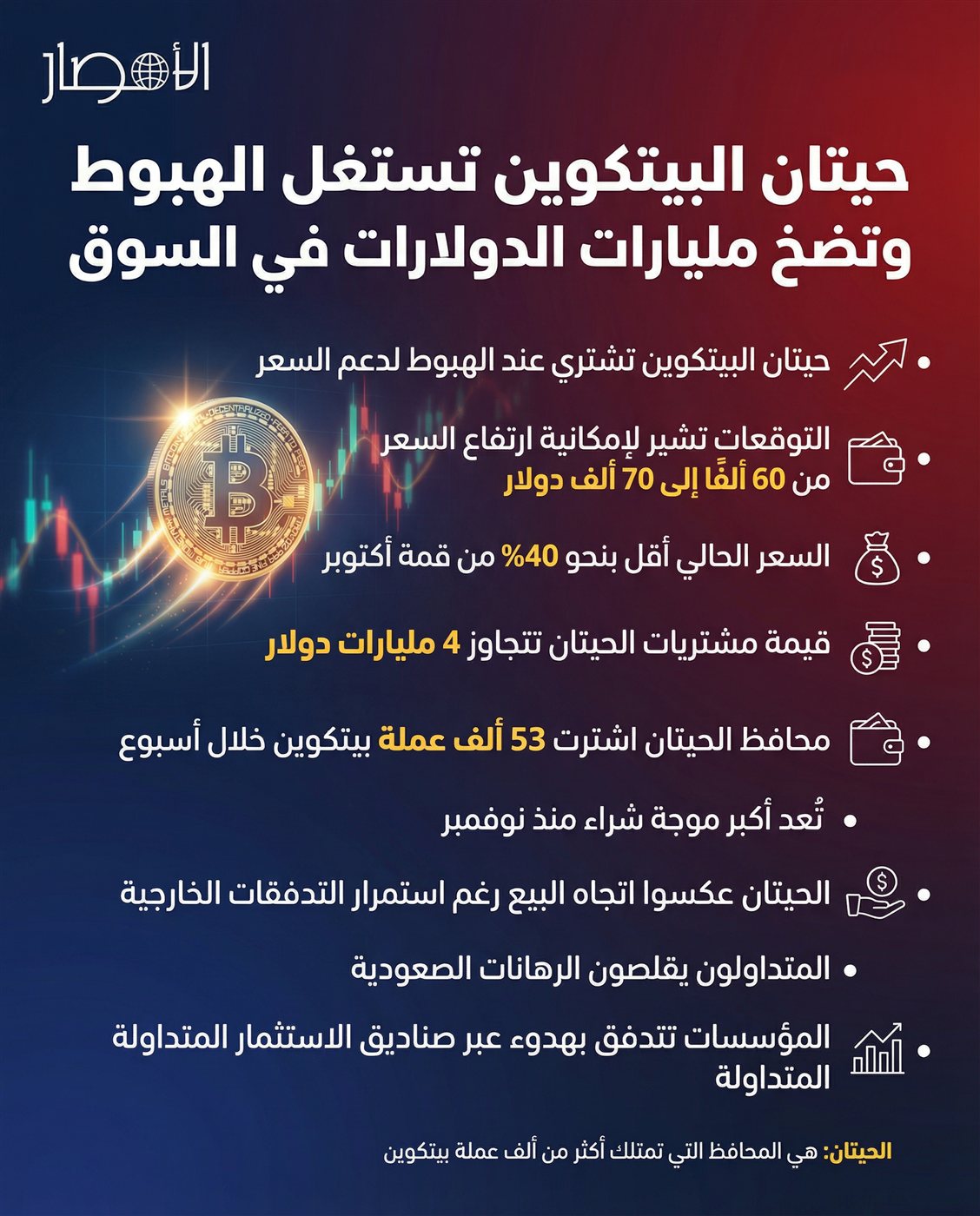 بالإنفوجراف.. حيتان البيتكوين تستغل الهبوط وتضخ مليارات الدولارات في السوق