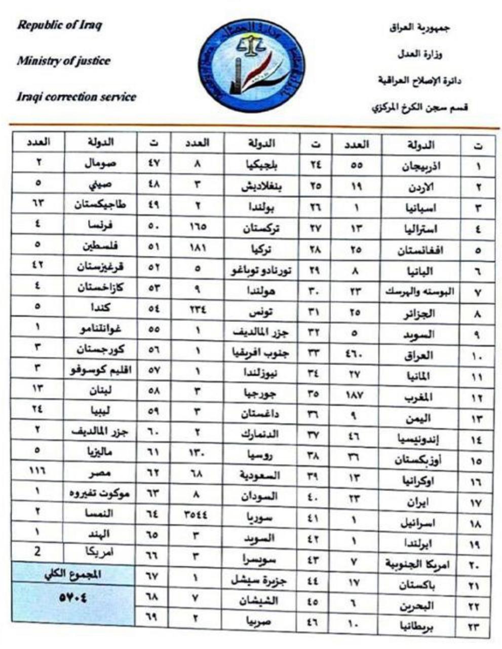 وقال المتحدث باسم وزارة العدل العراقية محمد لعيبي، إن العدد الكلي للسجناء المنقولين بلغ 5 آلاف و703، وينتمون لـ61 دولة.