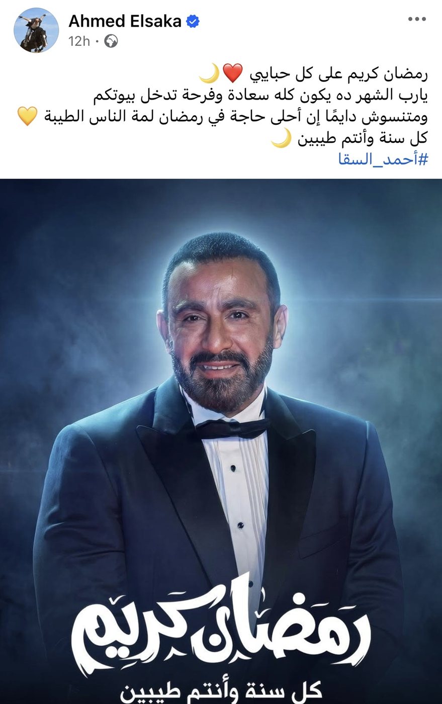 وكتب أحمد السقا عبر حسابه على فيسبوك: "رمضان كريم على كل حبايبي يارب الشهر ده يكون كله سعادة وفرحة تدخل بيوتكم ومتنسوش دايمًا إن أحلى حاجة في رمضان لمة الناس الطيبة كل سنة وأنتم طيبين".