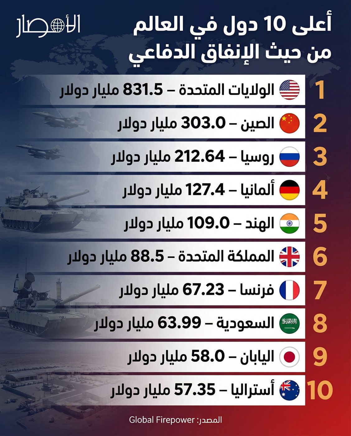 إنفوجراف.. أعلى 10 دول في العالم من حيث الإنفاق الدفاعي