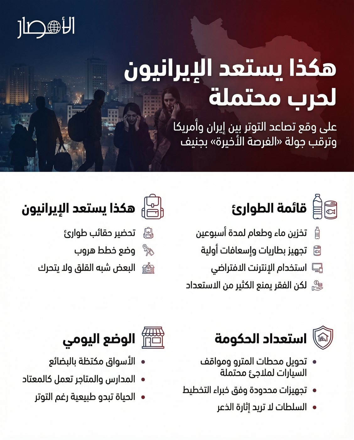 على وقع تصاعد التوترات الإقليمية وتزايد الحديث عن احتمال اندلاع مواجهة عسكرية، يعيش الإيرانيون حالة من القلق والترقب، تتباين مظاهرها بين من يجهزون حقائب طوارئ وخطط هروب، ومن يكتفون بالانتظار في ظل ضبابية المشهد.