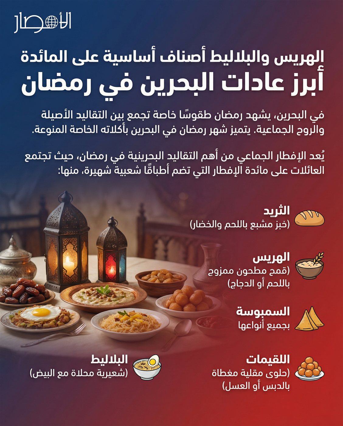 إنفوجراف| الهريس والبلاليط أصناف أساسية على المائدة.. أبرز عادات البحرين في رمضان