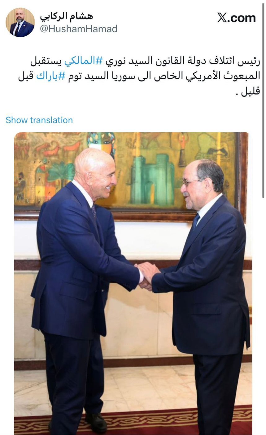 استقبل رئيس ائتلاف دولة القانون نوري المالكي، المبعوث الأمريكي الخاص إلى سوريا توم باراك، وذلك في لقاء تناول عددًا من الملفات السياسية ذات الاهتمام المشترك.