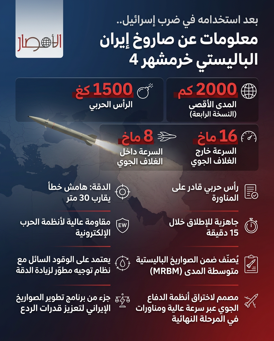 بعد استخدامه في ضرب أهداف إسرائيلية، تصدّر صاروخ خرمشهر 4 الإيراني العناوين الدولية كأحد أقوى الصواريخ الباليستية المتوسطة المدى ضمن الترسانة الإيرانية.