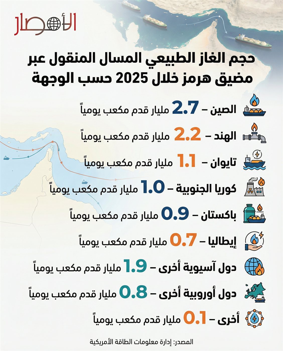 انفوجراف.. حجم الغاز الطبيعي المسال المنقول عبر مضيق هرمز خلال 2025