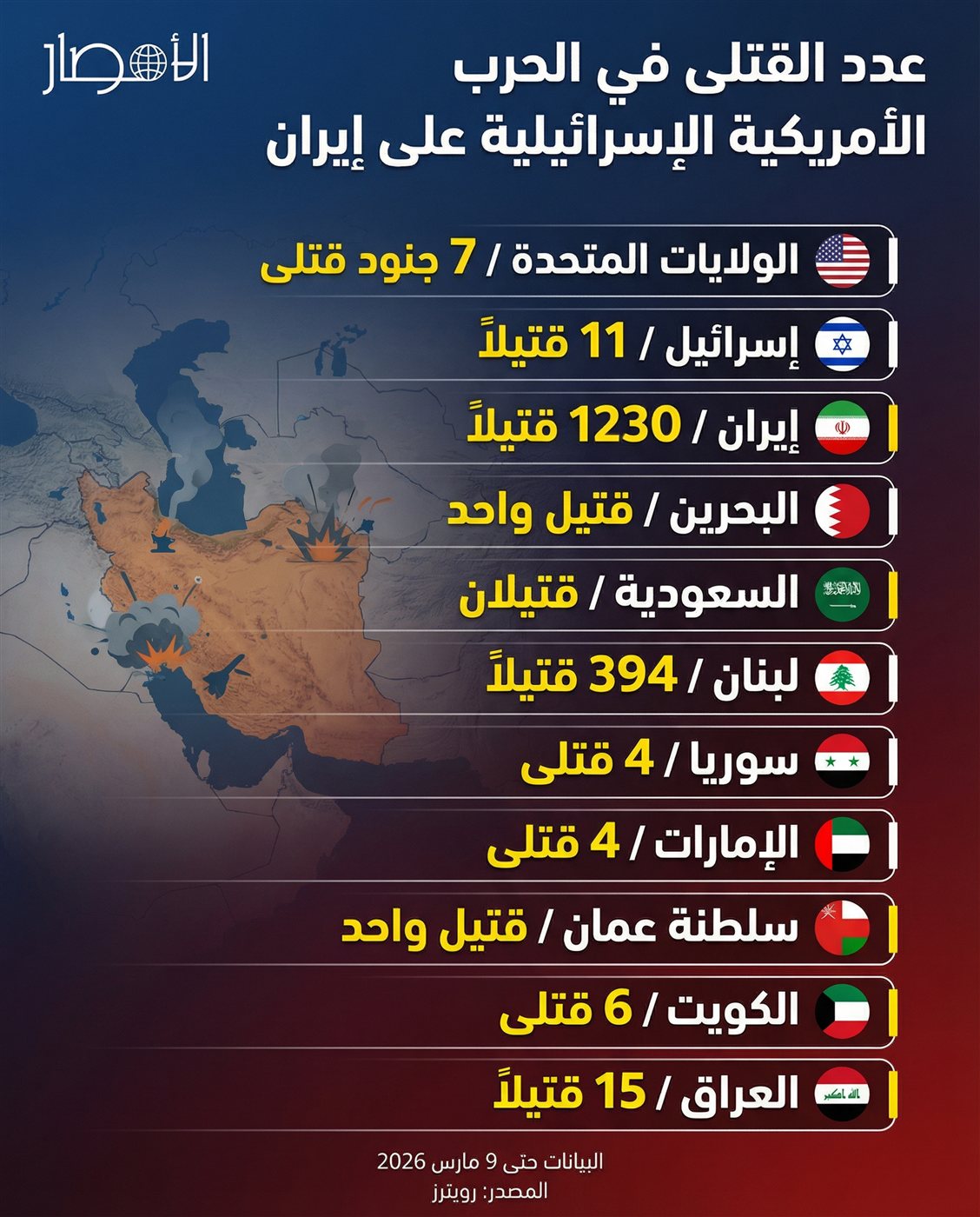 إنفوجراف| عدد القتلى في الحرب الأمريكية الإسرائيلية على إيران