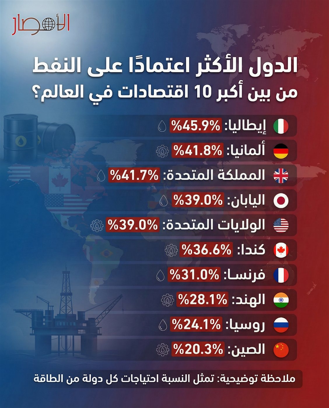 إنفوجراف.. الدول الأكثر اعتمادًا على النفط من بين أكبر 10 اقتصادات في العالم