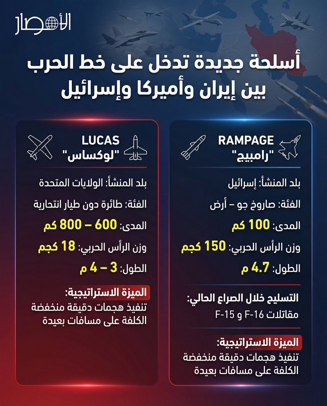 انفوجراف.. أسلحة جديدة تدخل على خط الحرب بين إيران وأمريكا وإسرائيل