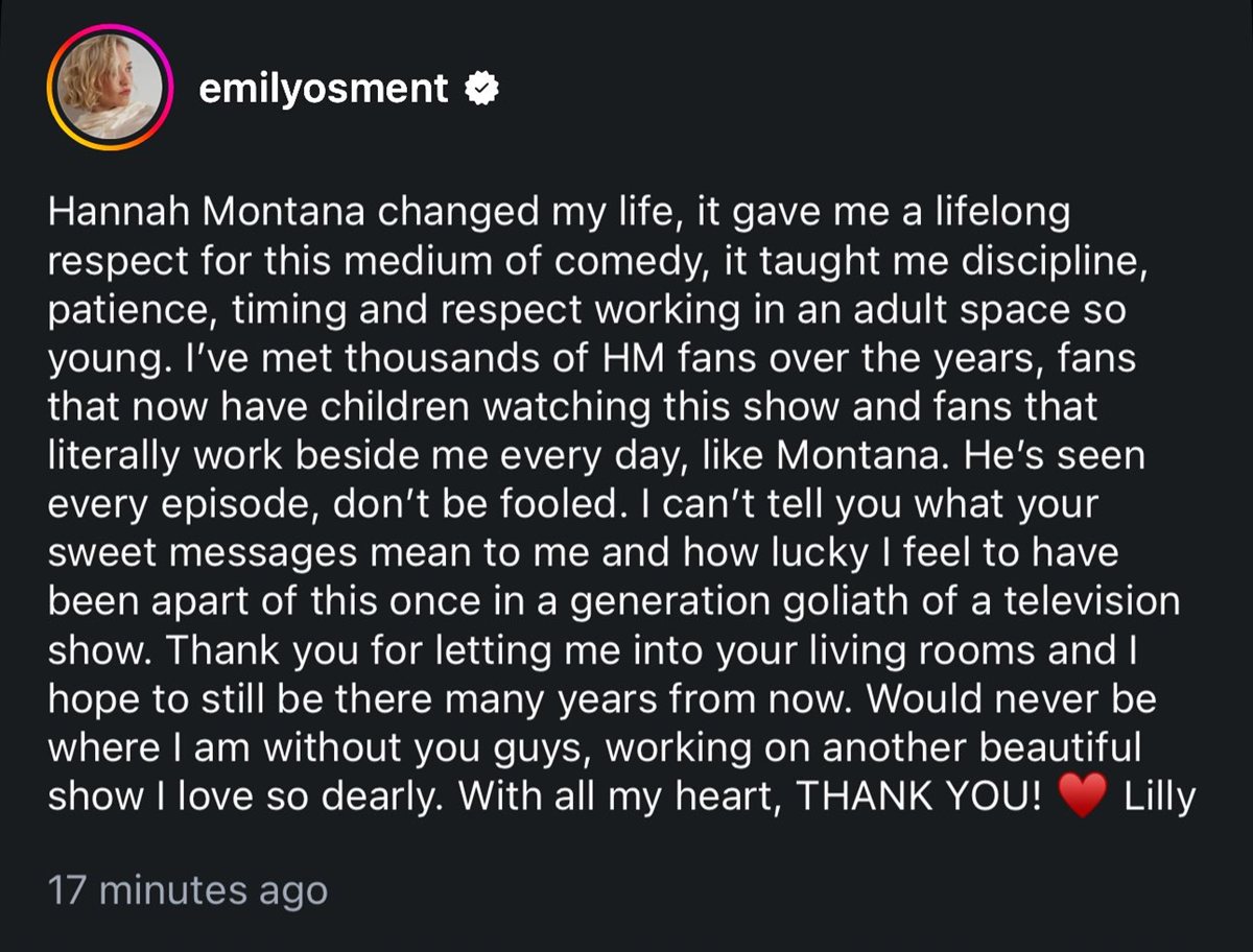 ووجهت إيميلي، رسالة إلى معجبي مسلسل هانا مونتانا، عبر حسابها الرسمي على موقع التواصل “إنستجرام”، قائلة: "لقد غيّر مسلسل "هانا مونتانا" حياتي... شكرًا لكم على مشاركتي في مسلسلاتكم، وأتمنى أن أبقى معكم لسنوات طويلة قادمة.. ما كنت لأصل إلى ما أنا عليه اليوم لولاكم، وأنا أعمل على مسلسل رائع آخر أحبه كثيرًا.. من كل قلبي، شكرًا لكم! - ليلي".