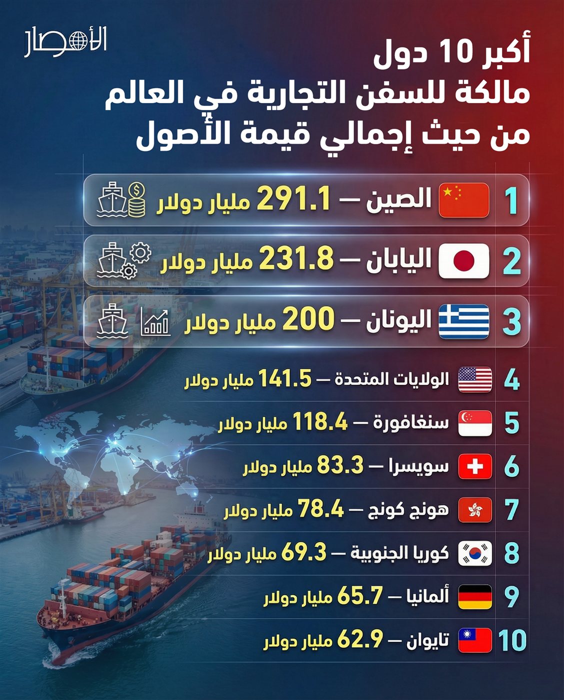 إنفوجراف| أكبر 10 دول مالكة للسفن التجارية في العالم من حيث إجمالي قيمة الأصول