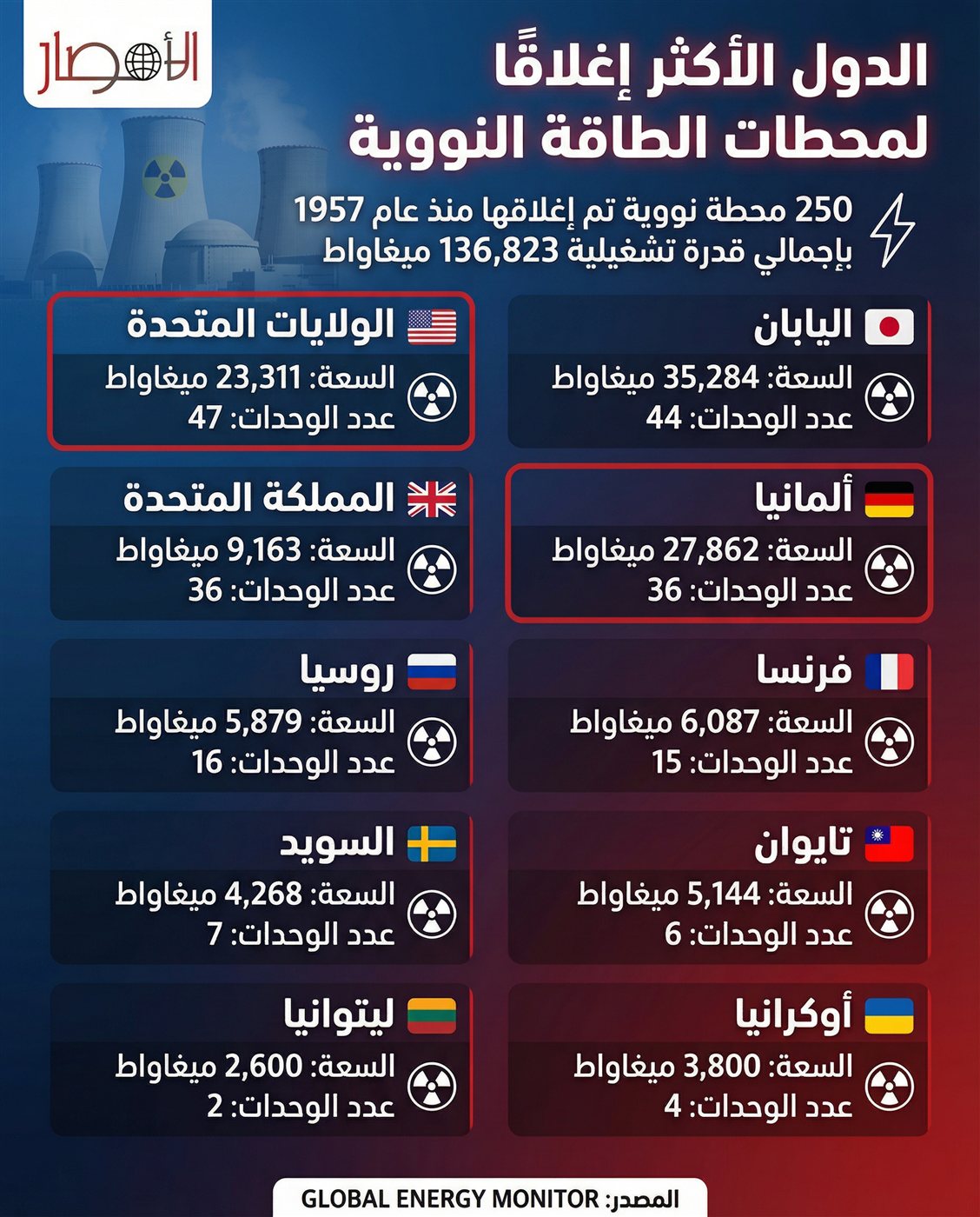 بالإنفوجراف.. تعرف على الدول الأكثر إغلاقًا لمحطات الطاقة النووية