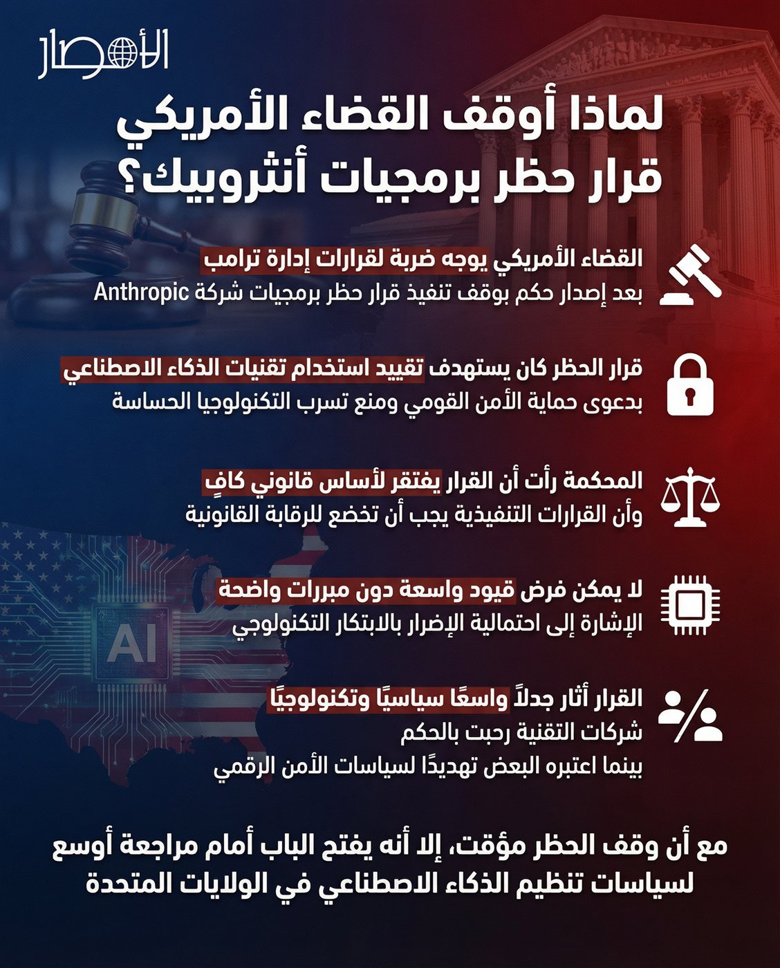 بالإنفوجراف.. لماذا أوقف القضاء الأمريكي قرار حظر برمجيات أنثروبيك؟