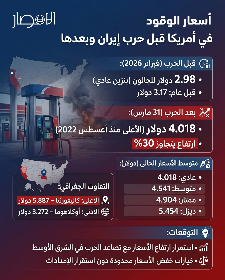 بالإنفوجرافيك| أسعار الوقود في أمريكا قبل حرب إيران وبعدها