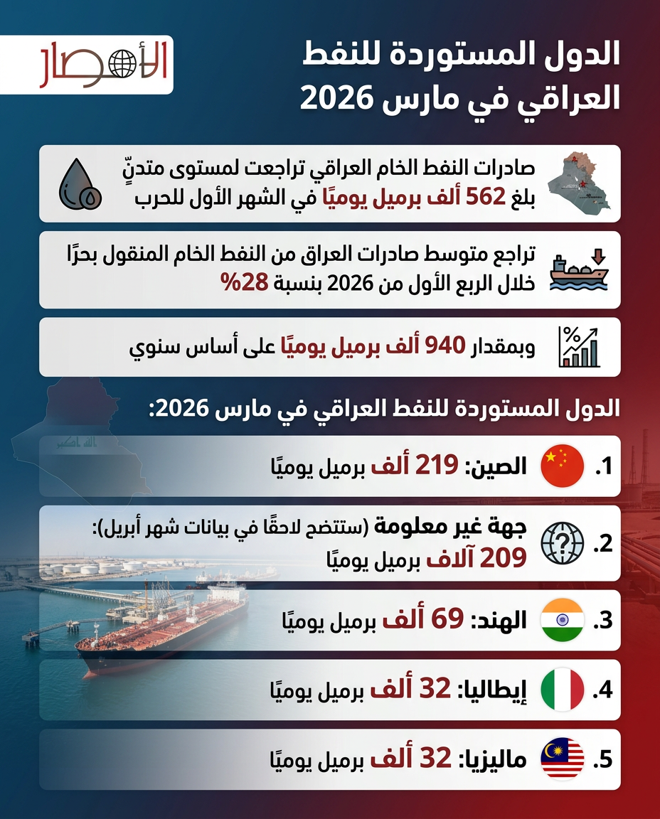 إنفوجراف| الدول المستوردة للنفط العراقي في مارس 2026