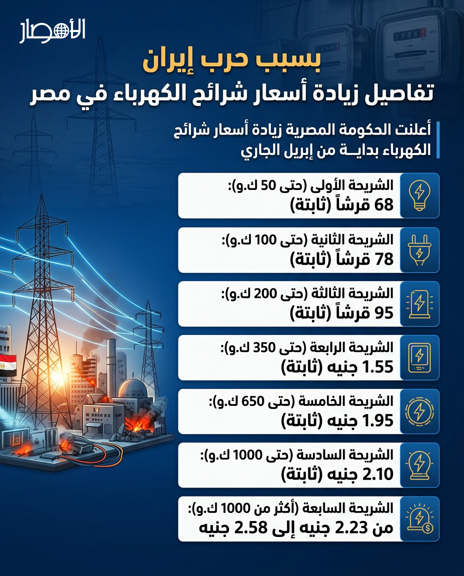 إنفوجراف| بسبب حرب إيران.. تفاصيل زيادة أسعار شرائح الكهرباء في مصر