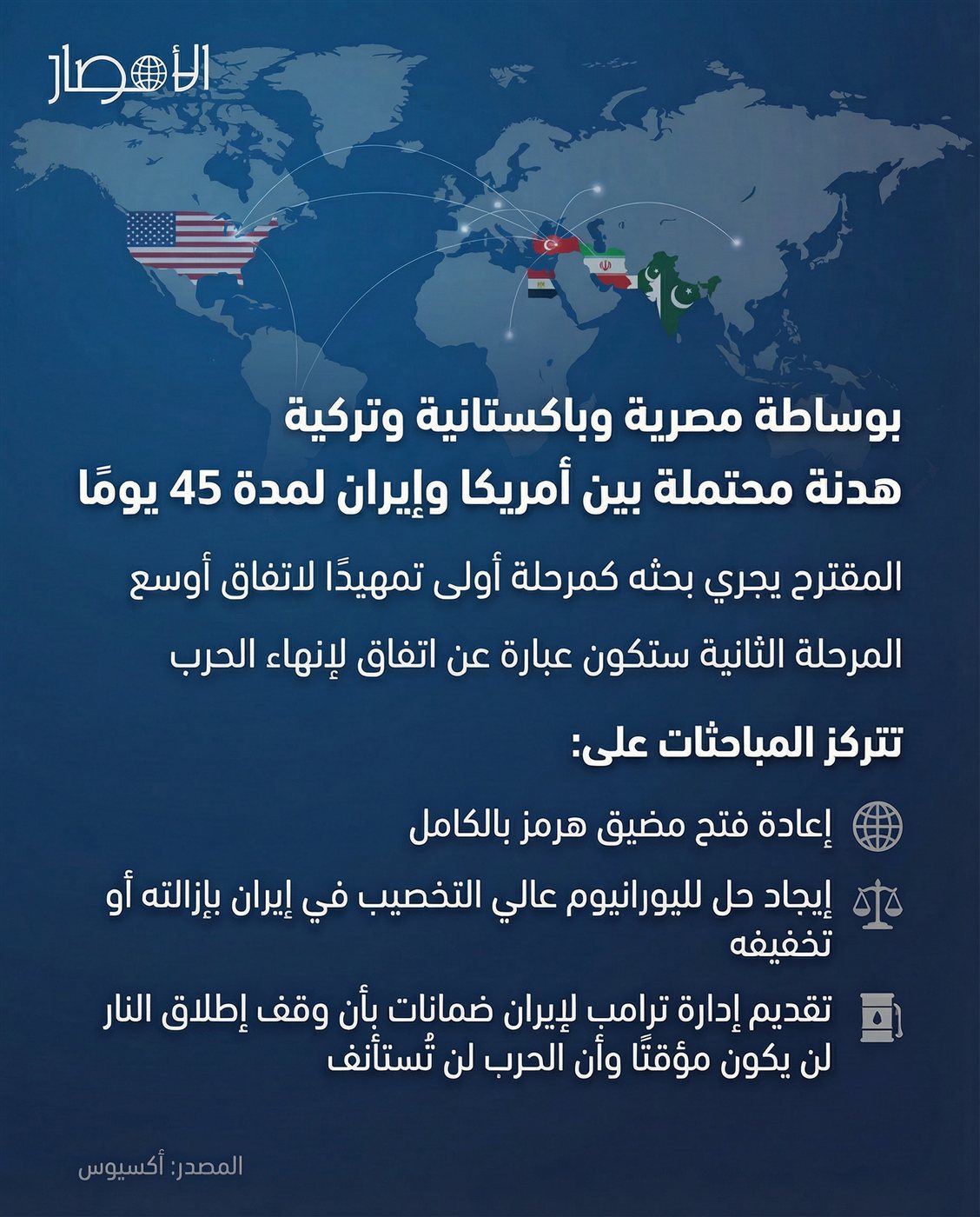انفوجراف| بوساطة مصرية وباكستانية وتركية.. هدنة محتملة بين أمريكا وإيران لمدة 45 يومًا