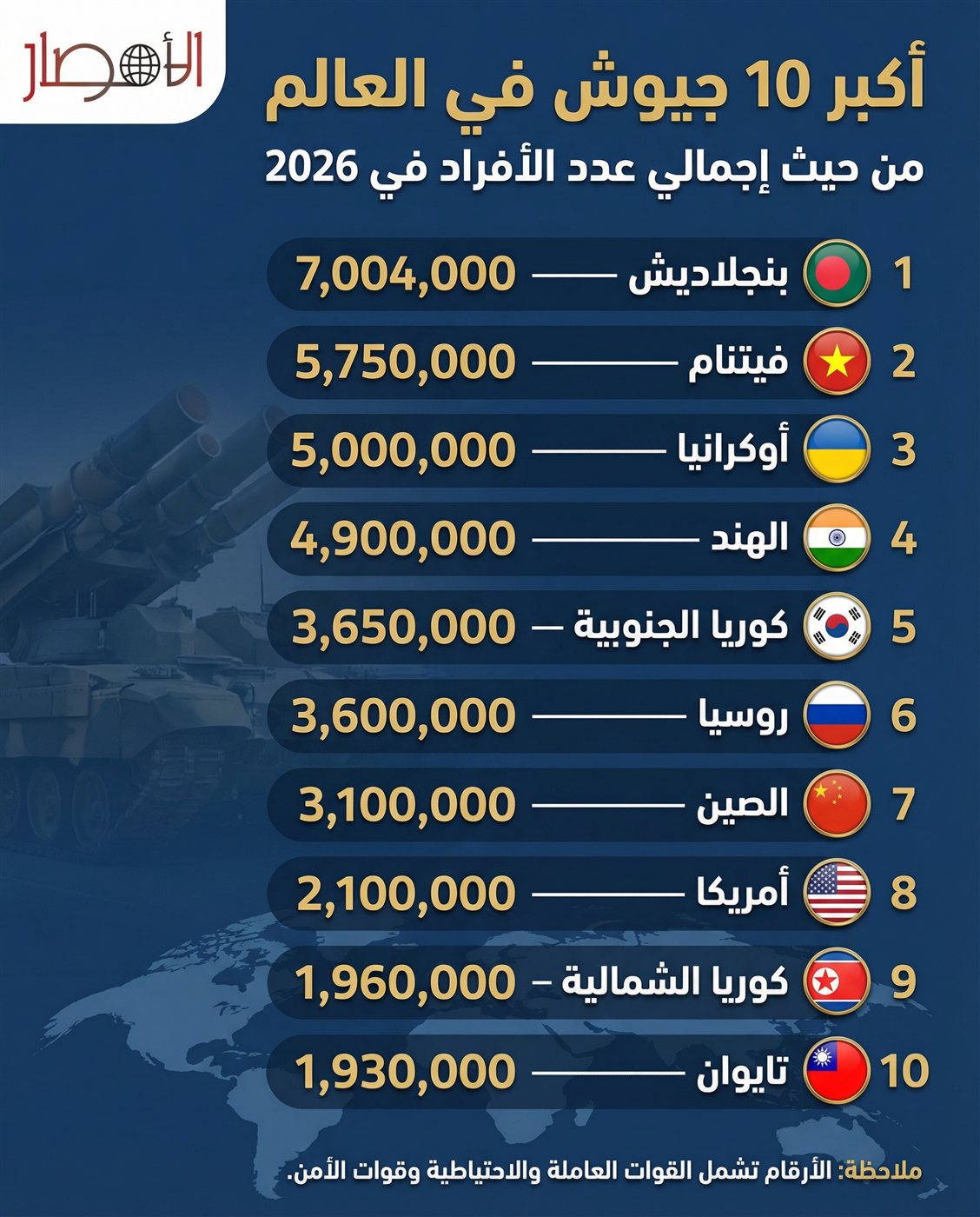 انفوجراف.. أكبر 10 جيوش في العالم من حيث إجمالي عدد الأفراد في 2026